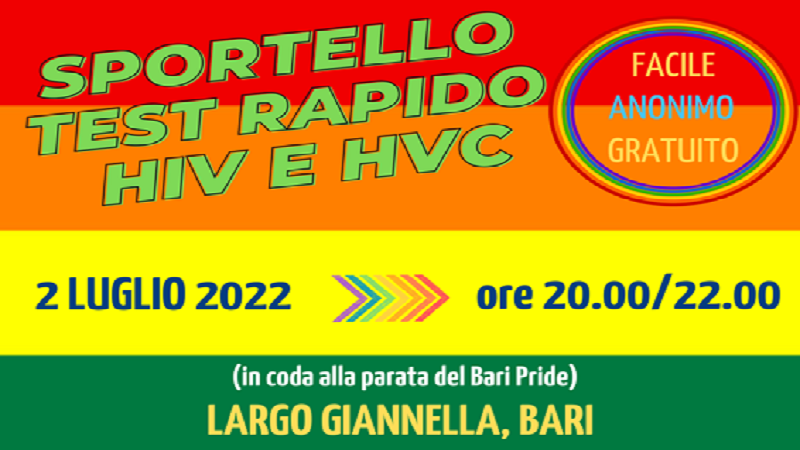 L’Unità di Strada “Care for People”, servizio finanziato dall’assessorato comunale al Welfare, aderisce al Bari Pride 2022 in programma domani, sabato 2 luglio, nel capoluogo pugliese. Per l’occasione, in largo Giannella dalle ore 20 alle ore 22, in coda alla parata, gli operatori dell’Unità di Strada, insieme ai volontari dell’associazione Cama Lila Bari, provvederanno ad effettuare test HIV salivari a risposta rapida all’interno del camper in favore di chiunque sia interessato.